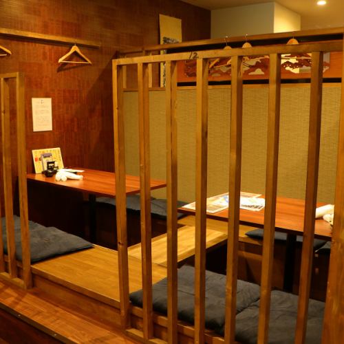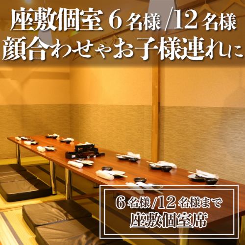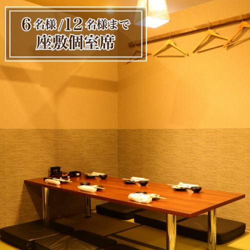 【12名様お座敷個室】床に座るタイプのお座敷席の6名席を結合したお席。。ふかふかの座布団をご用意しております!会社の同僚やお仲間同士での宴会、飲み会も大歓迎!ご宴会コースでのご利用はもちろん、アラカルト注文でのご利用でも、個室へご案内可能です。
